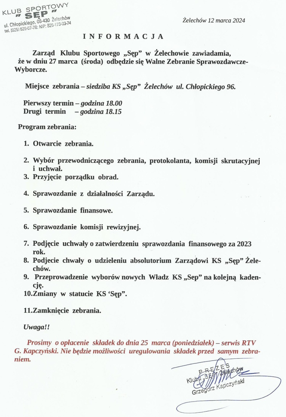 Zarząd naszego Klubu opublikował informację o terminie najbliższego Walnego Zebrania Sprawozdawczo-Wyborczego, które zostało zaplanowane na środę 27 marca 2024 r. o godzinie 18:00 w siedzibie Klubu Sportowego "Sęp" w Żelechowie, ul. Chłopickiego 96. Poniżej prezentujemy plan zabrania. Proszę zwrócić uwagę na konieczność uregulowania składek członkowskich aby móc uczestniczyć w głosowaniach.