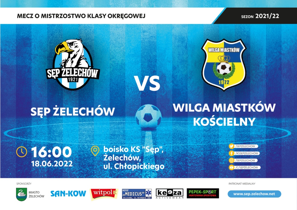 Nasza drużyna zakończy sezon 2021/22 meczem w Żelechowie. W ostatnim spotkaniu podopieczni trenera Pawła Trojeckiego będą podejmowali Wilgę Miastków Kościelny. Będzie to dobra okazja by zrewanżować się za przegraną 1:2 w rundzie jesiennej. Mecz zaplanowano na sobotę 18 czerwca o godzinie 16:00. Poprowadzi go trójka sędziowska w składzie Marcin Sokołowski, Przemysław Wójcicki i Szymon Wadas.