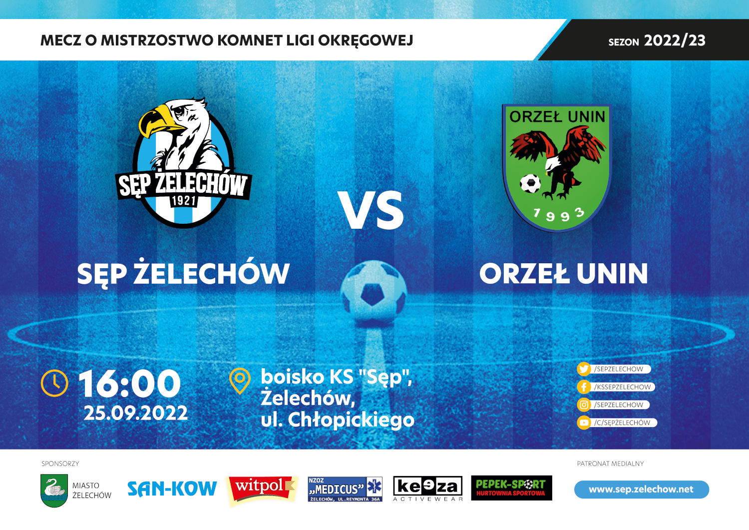 Sęp Żelechów po ubiegłotygodniowej przerwie już w niedzielę zagra mecz na własnym terenie. Przeciwnikiem podopiecznych trenera Tomasza Gugały będzie aktualny lider tabeli i jedna z najlepiej prezentujących się obecnie ekip czyli Orzeł Unin. Spotkania Sępa z Orłem w ostatnich miesiącach były niezwykle ciekawe i z pewnością podobnie będzie tym razem. Wszystkich serdecznie zapraszamy do wspierania naszych piłkarzy dopingiem, a Ci wybiegną na murawę już o godzinie 16:00. Mecz poprowadzi trójka sędziowska w składzie Arkadiusz Wróbel, Krzysztof Borkowski i Damian Śliwiński. Obserwatorem delegowanym z ramienia MZPN będzie Pan Wiesław Galas.