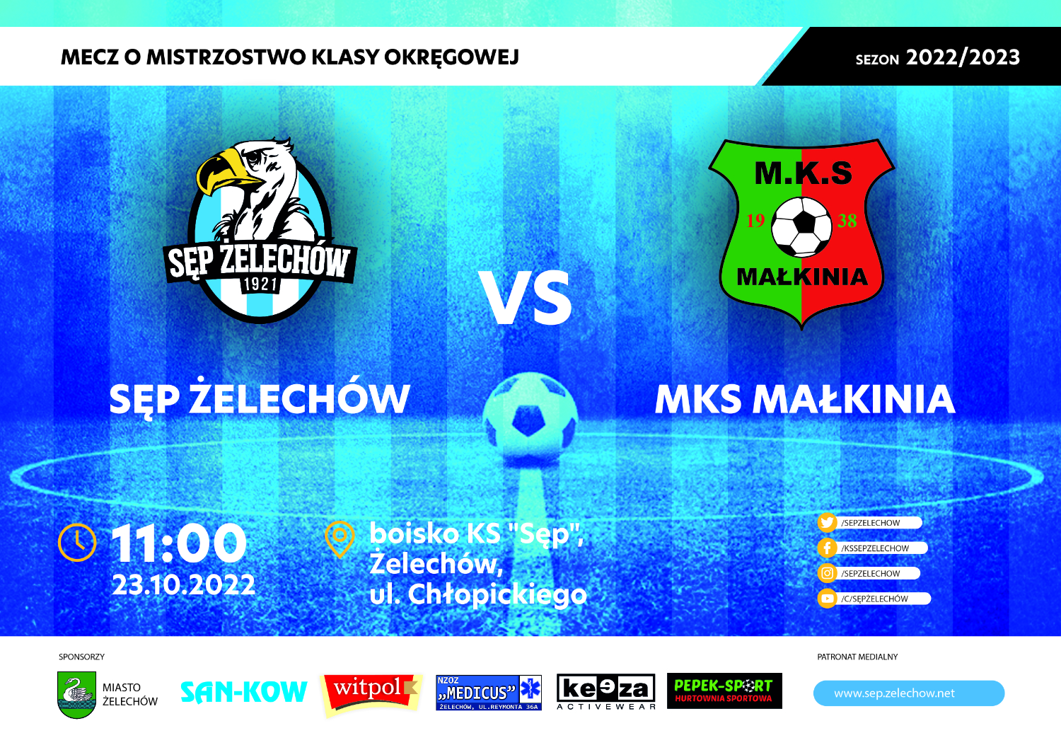 Występ naszej drużyny będzie można obejrzeć w niedzielne południe w Żelechowie. Sęp zmierzy się z zajmującą piąte miejsce w tabeli drużyną MKS-u Małkinia, która tydzień temu uległa na własnym terenie 2:3 Kosovii Kosów Lacki. Spotkanie poprowadzi trójka sędziowska w składzie Damian Śliwiński. Marcin Protasewicz i Tomasz Seredziuk.