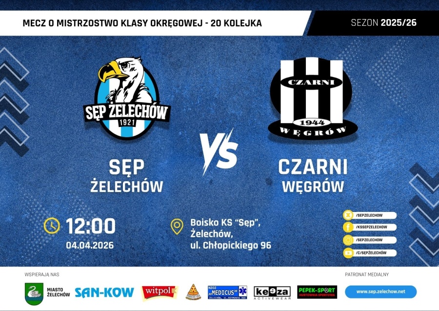 - Sęp Żelechów – Czarni Węgrów, godz. 12:00