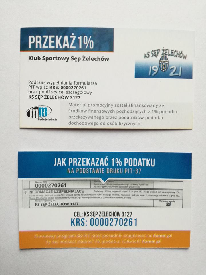 Dobiegł końca rok 2025. Już niebawem rozpocznie się okres rozliczeń z fiskusem. Każdy kto będzie się rozliczał bez żadnych zbędnych zachodów i kosztów może przekazać 1.5% należnego podatku na rzecz wskazanego stowarzyszenia, organizacji itp. W tym miejscu jako Stowarzyszenie Klub Sportowy "Sęp" w Żelechowie zwracamy się do Państwa o przekazanie 1.5% podatku właśnie na cele statutowe naszego Klubu. Jako że nie jesteśmy Organizacją Pożytku Publicznego tak jak wiele innych klubów sportowych współpracujemy z Fundacją Studencką Młodzi - Młodym która pośredniczy w zbieraniu środków 1.5% na rzecz naszego klubu. Jedyne co jest ważne do prawidłowego przekazania środków 1.5% to numer KRS ( w naszym przypadku 0000270261 ) oraz CEL: KS SĘP ŻELECHÓW 3127 oraz postawienie znaku x w polu Wyrażam Zgodę. Te dane trzeba oczywiście wpisać na druku PIT-37 lub po prostu zlecić to księgowości dokonującej rozliczenia.